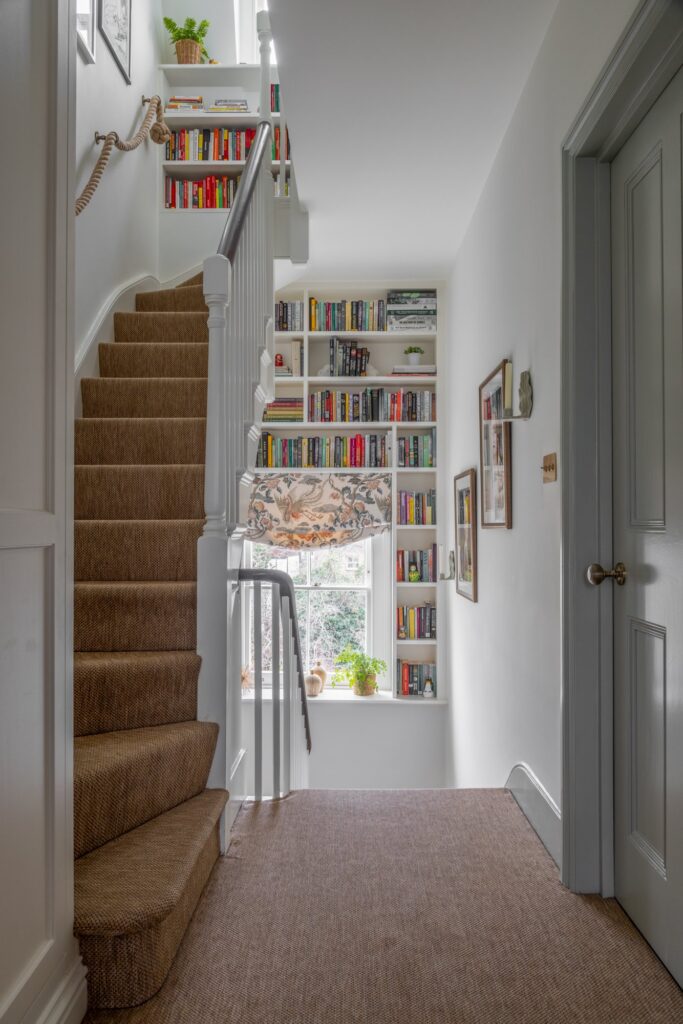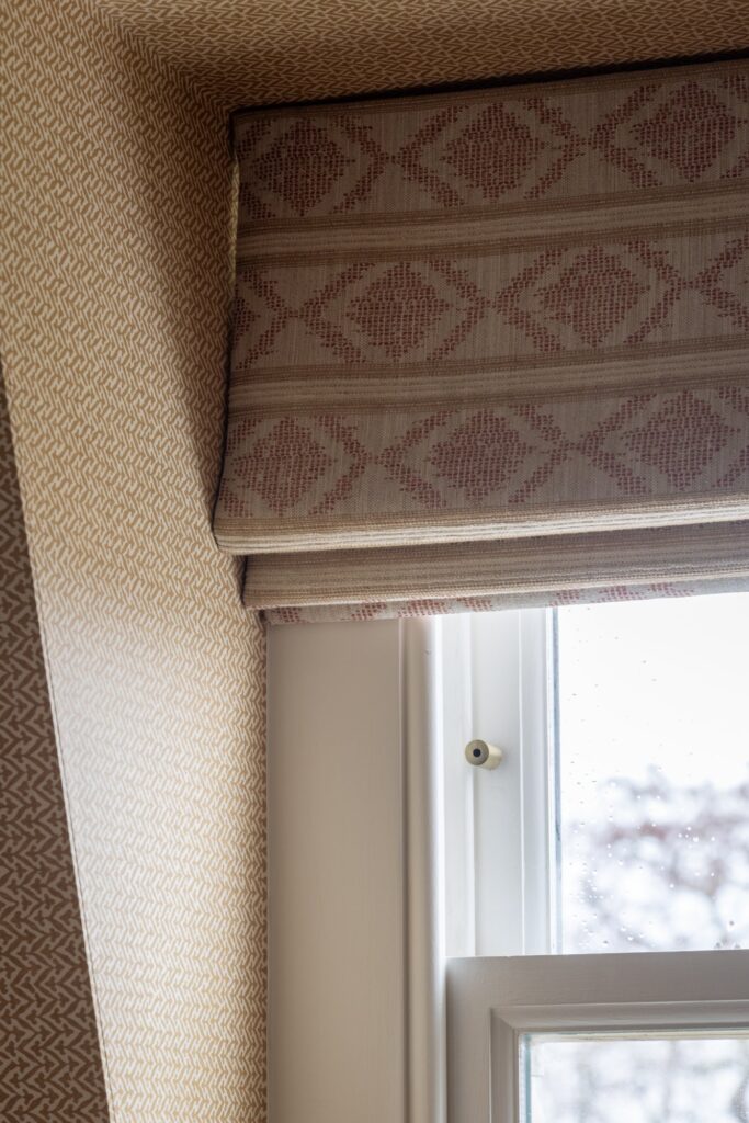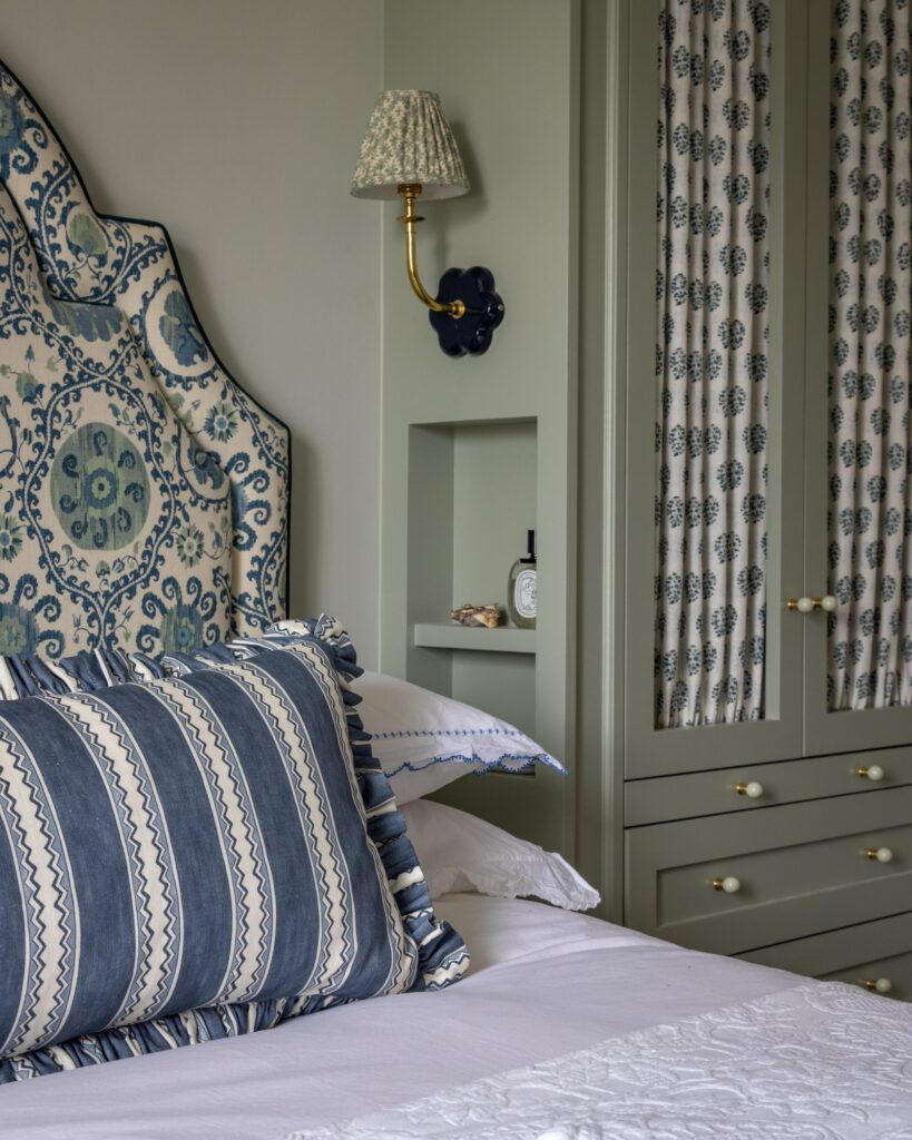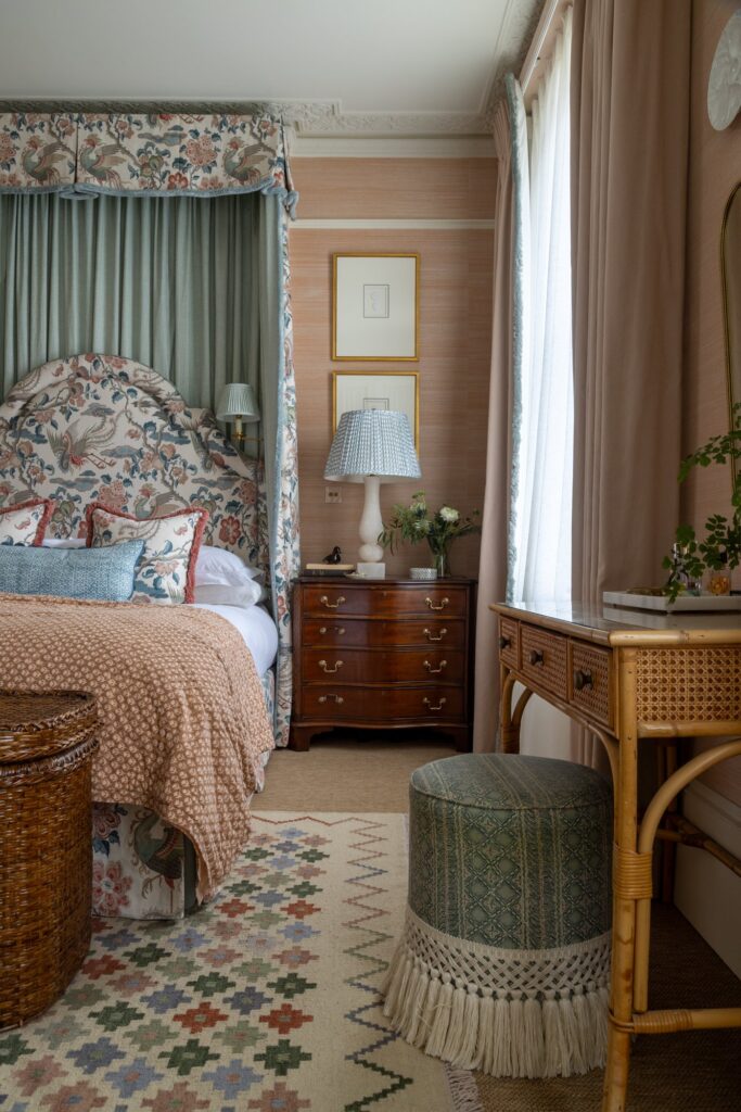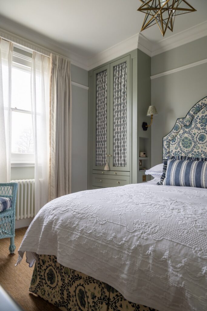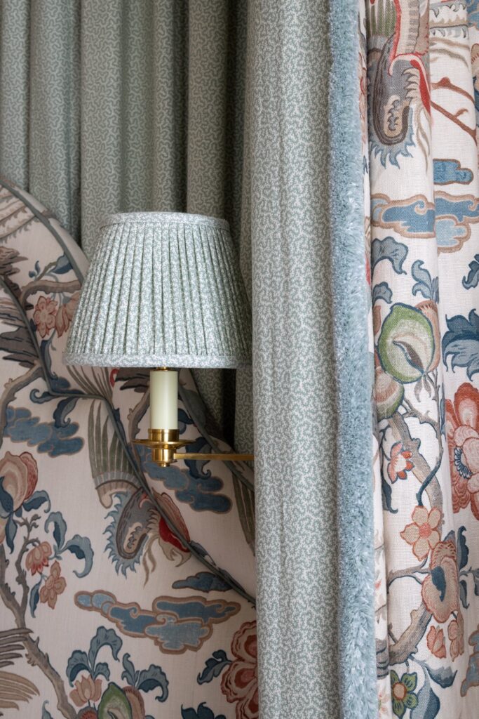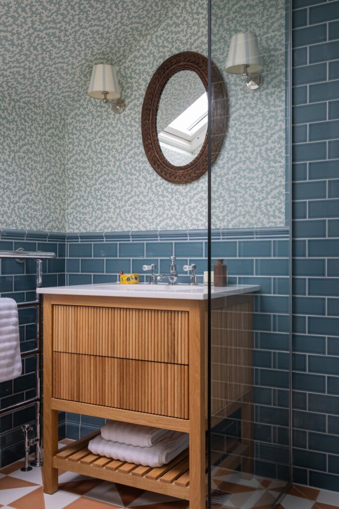 Our approach was to infuse the house with character through confident use of colour and pattern, ensuring each room felt purposeful while still connected to the wider story of the home. Phase one focused on the upper floors, starting at the top of the house. Here, we created a flexible space for the husband to work from home and run his business while also functioning as a relaxed TV area and guest bedroom, a room designed to adapt as family life evolves and to comfortably accommodate guests when they come to stay.