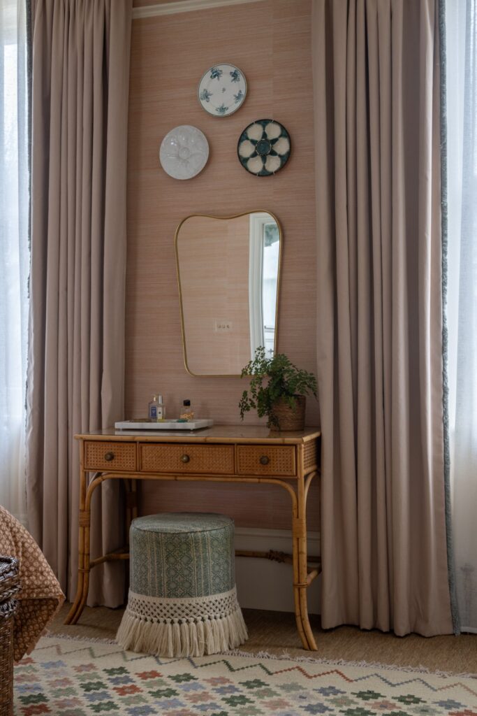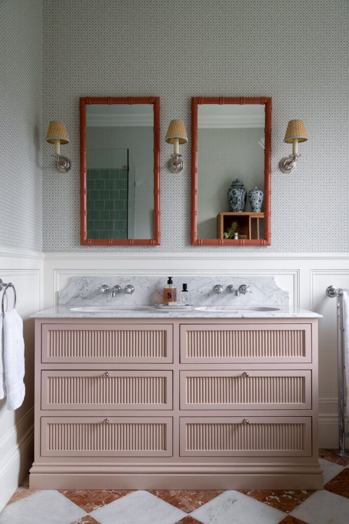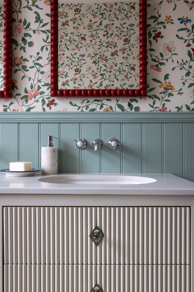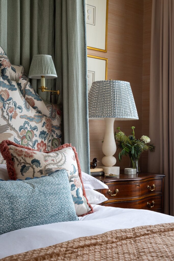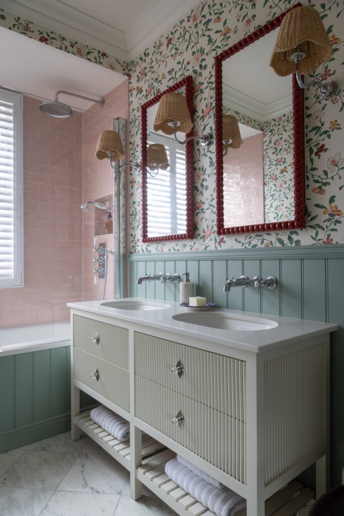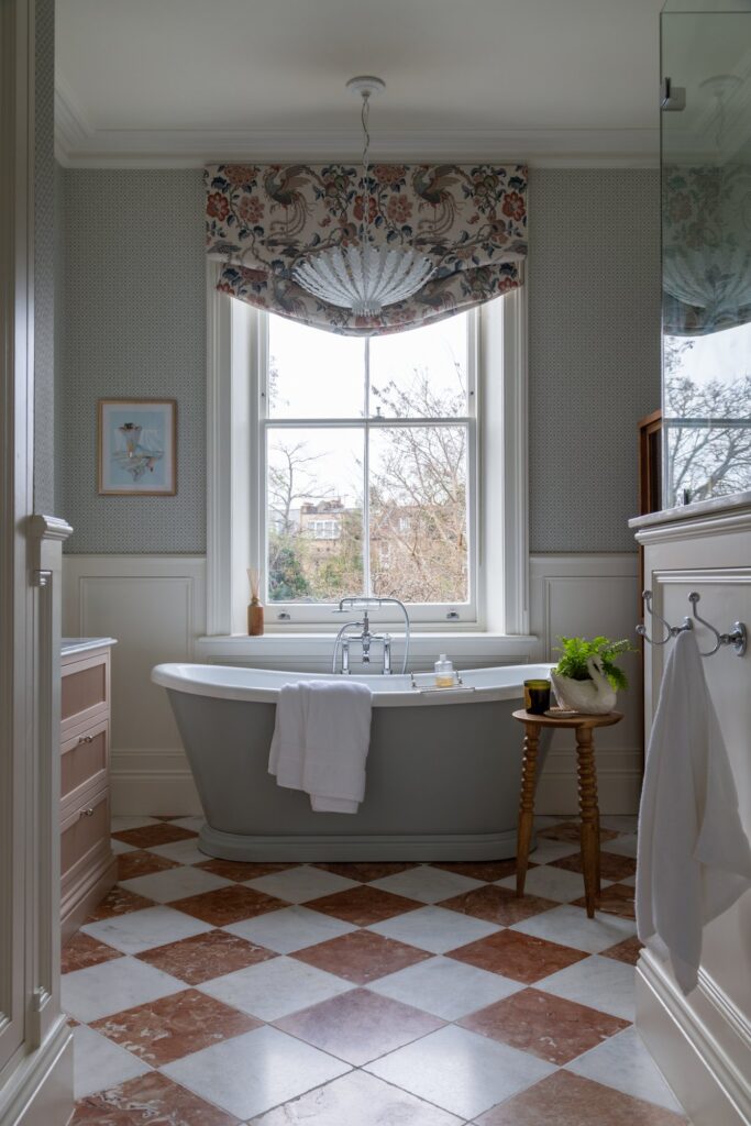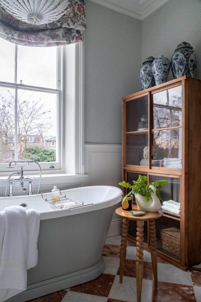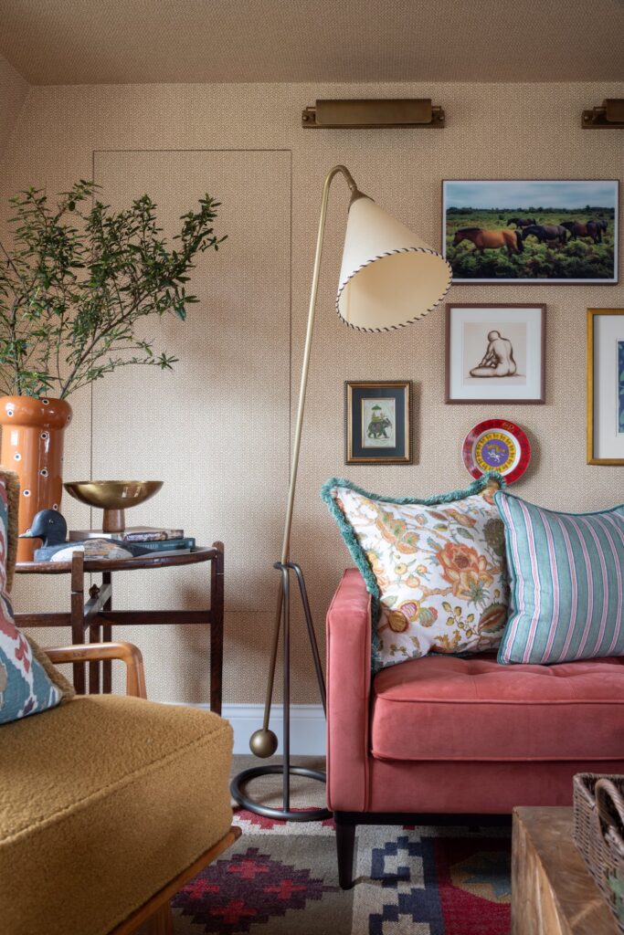 Our approach was to infuse the house with character through confident use of colour and pattern, ensuring each room felt purposeful while still connected to the wider story of the home. Phase one focused on the upper floors, starting at the top of the house. Here, we created a flexible space for the husband to work from home and run his business while also functioning as a relaxed TV area and guest bedroom, a room designed to adapt as family life evolves and to comfortably accommodate guests when they come to stay.
